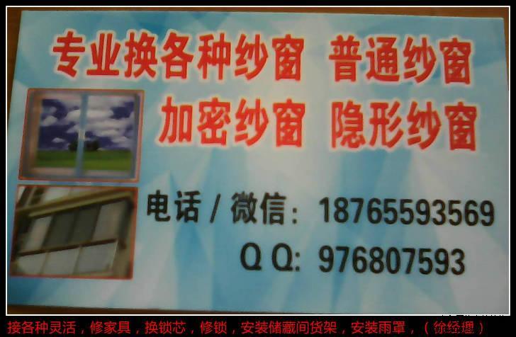 德州平原縣紅果家政:專業(yè)換各種紗窗,普通紗窗,加密紗窗,定做隱形紗窗,換各種滑輪,承接各種零活,打墻眼,鉆鐵眼,刷油漆,更換LED燈管,修椅子,維修小家店,更換插座開關(guān),切割地板磚,修家具,安裝雨罩,安裝儲(chǔ)藏室貨架,電氣焊,更換密封條,安裝液晶電視掛架,修鎖更換鎖芯,換油煙機(jī)煙管,安裝油煙機(jī),更換晾衣架鋼絲繩,安裝門吸,安裝窗簾,qq976807593