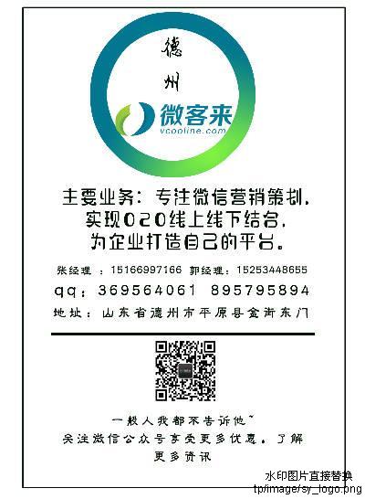公司簡介:德州微客來主要公眾號應(yīng)用開發(fā),商家公眾號定制開發(fā),我們緊扣市場需求,結(jié)合目前公眾號市場營銷趨勢,開發(fā)出數(shù)十種微信營銷模式,重點幫助企業(yè)解決目前O2O移動電子商務(wù)時代如何把握市場趨勢,以及微信線上商城的平價搭建,卻帶來無限制的營銷利潤的線上營銷。而且德州微客來還有專利紅包加粉碼、紅包分享碼、等高效低成本加粉方式。歡迎各界朋友撥打電話咨詢洽談。